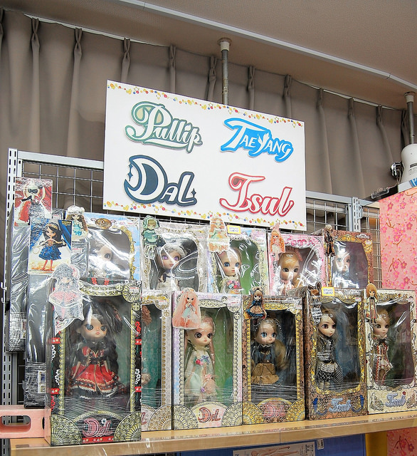 Creator’s Label Pullip Lupinus and Dal Quince are prominently featured in the display case. This store has a nice selection of dolls including SDCC Pullips Wonder Woman and Harley Quinn (these seem to be the original versions not the newer releases), Dal Alpin, Creator’s Label Dal Quince, Dal Cherry Sweet, Dal Dana, Pullip Optical Alice, Angelic Pretty Pullip Marie, Creator’s Label Pullip Lupinus, Isul Caros, Isul Eder, Pullip Eve Sweet, Pullip Bonnie, Dal Alice in Steampunk World, Isul White Rabbit in Steampunk World & Taeyang Dodo in Steampunk world.