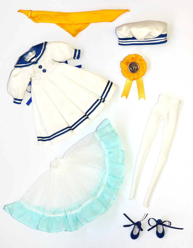 The Marine Dress Feminine Style is a very sweet interpretation of the theme. It is honestly my least favorite of the three that isn’t too say it isn’t a nice well-made outfit set it is just burgeoning on too a little too sugary sweet for my own personal taste/style though I realize that this will likely be the most popular of the three. I do love the addition of the floral detailing on the sleeves as well as the lavender color they chose for the accessories.