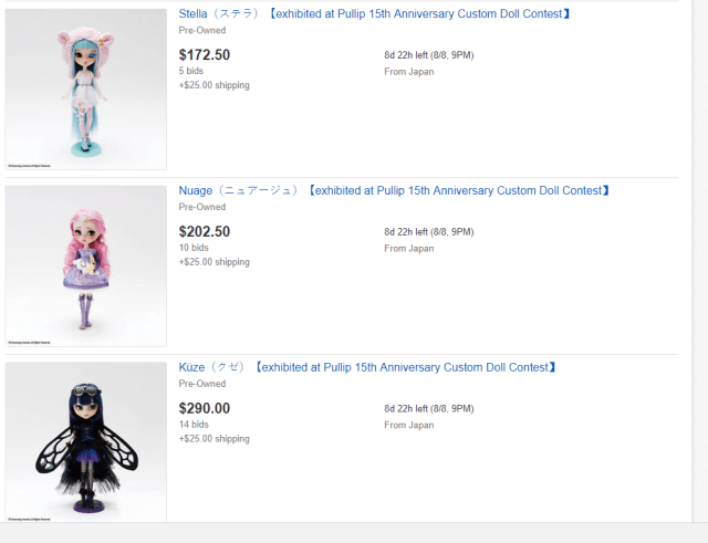 To celebrate Pullip’s 15th Anniversary Groove hosted an event at Yokohama Doll House, there was a custom doll contest held in conjunction with the event with the winning doll getting the chance to become a Pullip release. Groove had previously mentioned that some of the custom dolls would be placed up for auction to benefit charity (artists could opt out and request their dolls be returned to them). Groove has just recently posted that the dolls are up for auction on eBay, the bidding war for some of the dolls is already pretty intense you can see all of the dolls that are up for auction here.