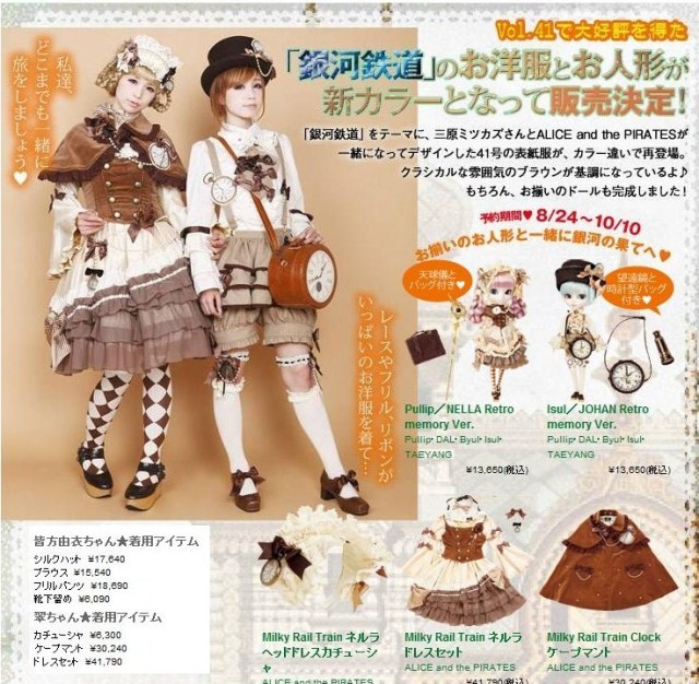 In December of 2011, Pullip Nella and Johan were released they were inspired by an illustration by Mitsukazu Mihara that originally appeared in a volume of Gothic & Lolita Bible. The illustration also inspired the release of people sized lolita clothing by Baby, The Stars Shine Bright sub-brand Alice and the Pirates. Due to the popularity of the original set, Nella and Johan were rereleased one year later in a new brown colorway they were called the Retro Memory Version presumably due to their outfit sets having a sepia/old timey photo undertone to them.