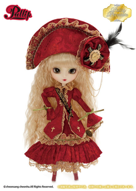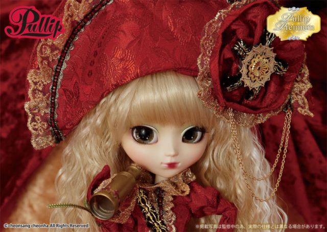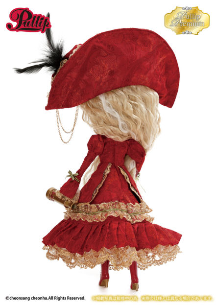 Stock: Pullip Premium Veritas Deep Crimson Version’s stock outfit includes a bicorne hat, skirt, blouse, sash, boots, tights and a telescope.